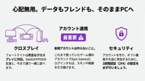 重要なのは「Epic Gamesアカウント」の連携です。これまで家庭用ゲーム機で遊んでいたデータをPCでも使いたい場合は、新しくアカウントを作るのではなく、既存の家庭用ゲーム機のアカウントを使ってEpic Gamesのサイトにログインしてください。